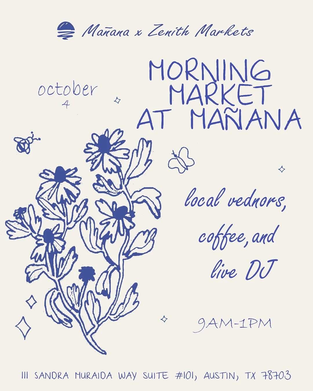 Join us for our Morning Mañana Market on October 4th from 9AM–1PM. A morning of local vendors, a live DJ, coffee and more! RSVP below to save your spot!